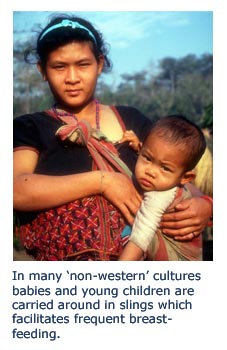 However, in many other cultures the baby 'lives' on his or her mother, is carried around in a sling with direct access to the lovely 'organic milk food deposits' to get small sip whenever the need arises.